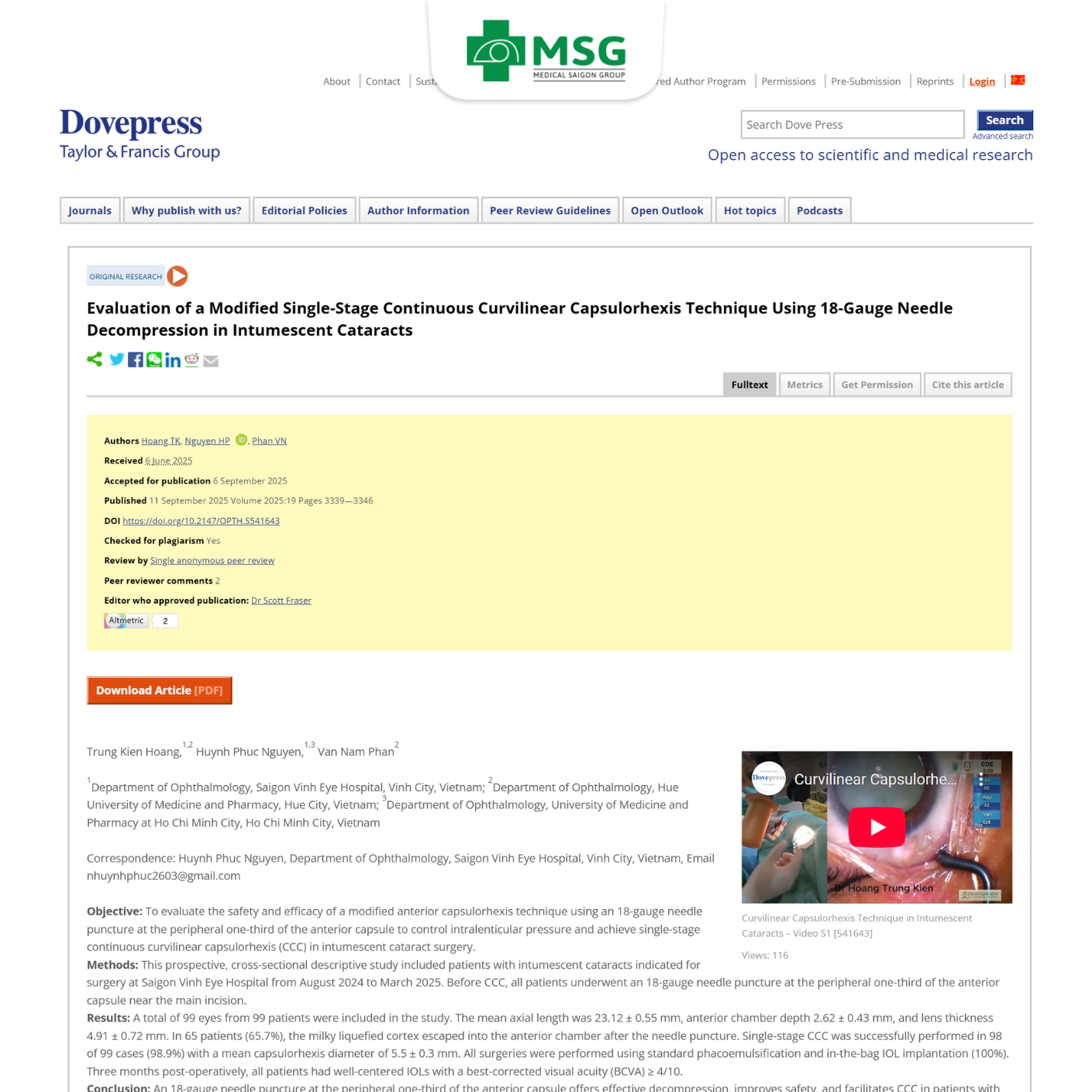 Thành tựu nghiên cứu khoa học nổi bật của Bác sĩ CKII Hoàng Trung Kiên cùng các cộng sự là bài nghiên cứu “Đánh giá kết quả kỹ thuật xé bao trước kết hợp chọc kim 18G vị trí 1/3 ngoài bao trong phẫu thuật đục thủy tinh thể chín trắng căng phồng” (Tên tiếng Anh: “Evaluation of a Modified Single-Stage Continuous Curvilinear Capsulorhexis Technique Using 18-Gauge Needle Decompression in Intumescent Cataracts”) vừa được đăng tải trên tạp chí y khoa danh tiếng Clinical Ophthalmology.